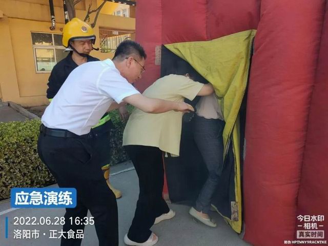 車間、外圍員工逐個體驗應(yīng)急逃生帳篷項目